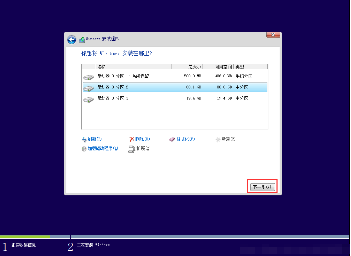 5、選中“驅動器 0 分區2”,點擊“格式化”進行格式化,這是需要安裝操作系統的盤,也就是安裝好系統后的C盤,若之前電腦內其它盤有文件,不要動,只需將這一個盤格式化即可,安裝好系統后其它盤的文件還存在。