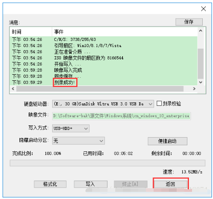8、這時軟件會將系統文件寫入U盤,當出現“刻錄成功!”信息后說明U盤啟動盤已經制作完成,點擊“返回”退出即可。