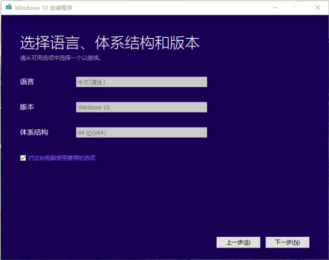 4、一般默認設置即可,根據自己要安裝系統的電腦配置決定。如果制作啟動盤和裝機的是同一臺電腦,那就勾選“對這臺電腦使用推薦的選項”,不然就取消勾選。