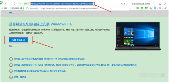 1、首先需要在一臺可正常上網的電腦打開win10官網:microsoft.com/zh-cn/software-download/windows10。進入后即可點擊立即下載工具,然后插入空白u盤進電腦。