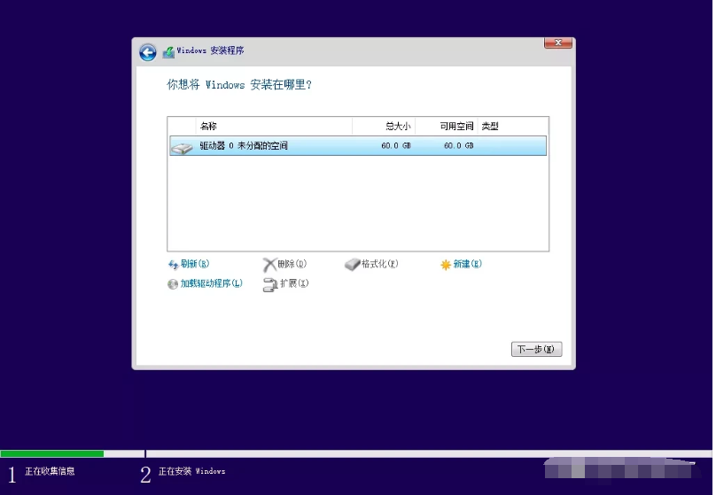 6、小編用的是虛擬機,磁盤還沒有分區,這種情況直接點下一步就行,系統會自動分區。