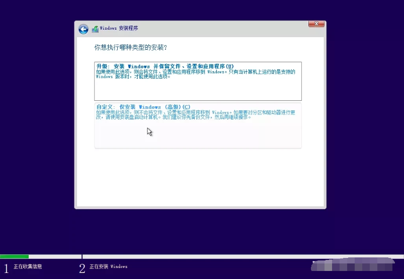 5、點擊同意協議,選擇下一步,升級一般在系統內打開映像才能進行,所以選擇下面的自定義。