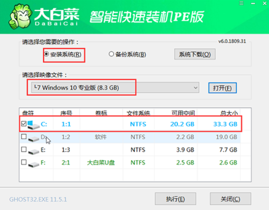 4、點擊打開大白菜一鍵裝機,選擇“安裝系統”,選擇已下載的0鏡像系統作為“映像文件”安裝到“C盤”進行執行;