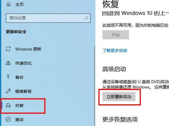 3.點擊恢復,在高級啟動里點擊“立即重新啟動”,系統重啟后進入高級啟動選項,然后我們依次選擇“疑難解答”->“高級選項”->“啟動設置”->“重啟”,使用數字鍵4或者F4,選擇“啟用安全模式”。