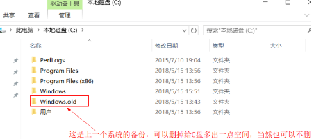 9、進入win10系統后,C盤下有個【Windows.old】, 這個是在安裝win10前的上一個系統的備份,根據自己需求選擇是否刪除即可,刪掉會給C盤空出多一點空間。