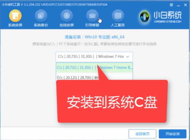 8、選擇好C盤以后,點擊“開始安裝”,稍作等待即可。