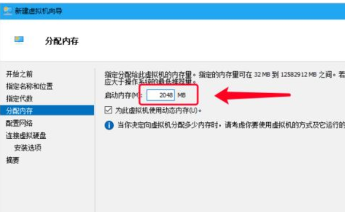 8、將啟動內存設置為2048MB,在“為此虛擬機使用動態內存”前打勾。