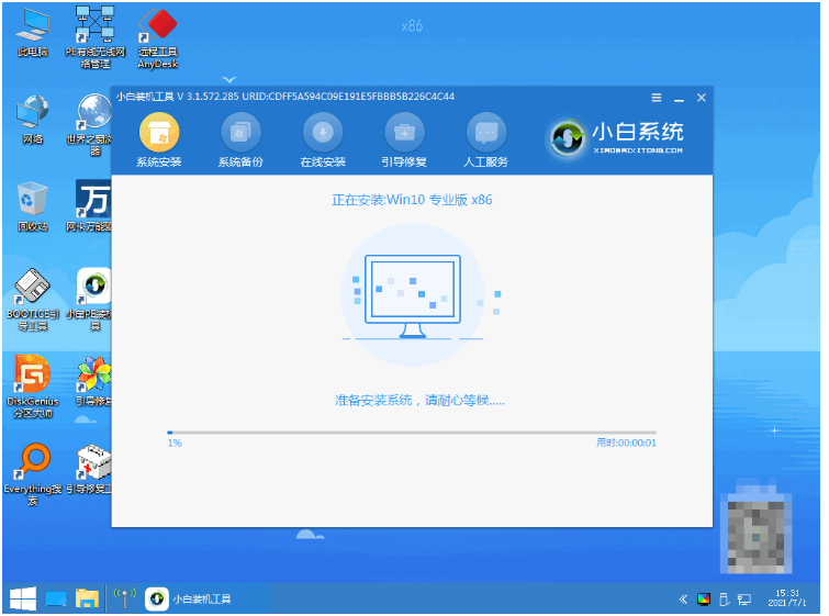 5、在 PE 系統中,裝機工具會自動幫大家重裝win10,完成后就可以再次重啟電腦。