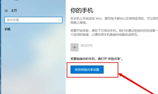 2、點一下手機選項,進入后點一下轉到體驗共享設定按鈕,這個時候會進入體驗共享面版。