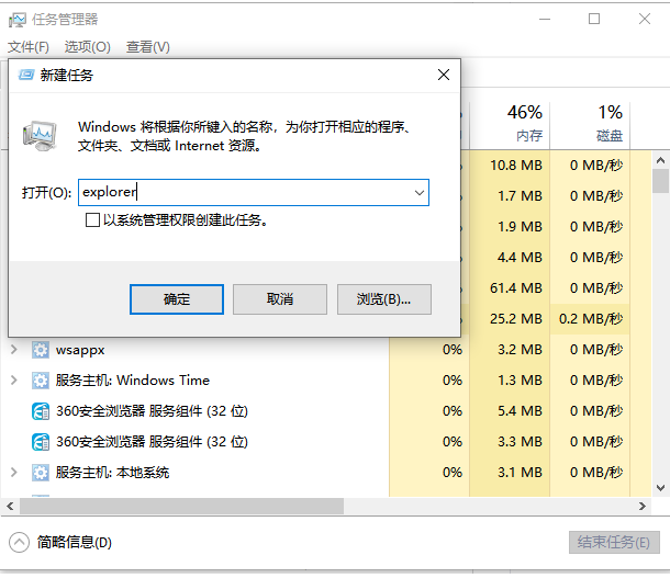 3、輸入“explorer”,點擊確定,耐心等待系統重啟管理器后將會出現桌面圖標了。