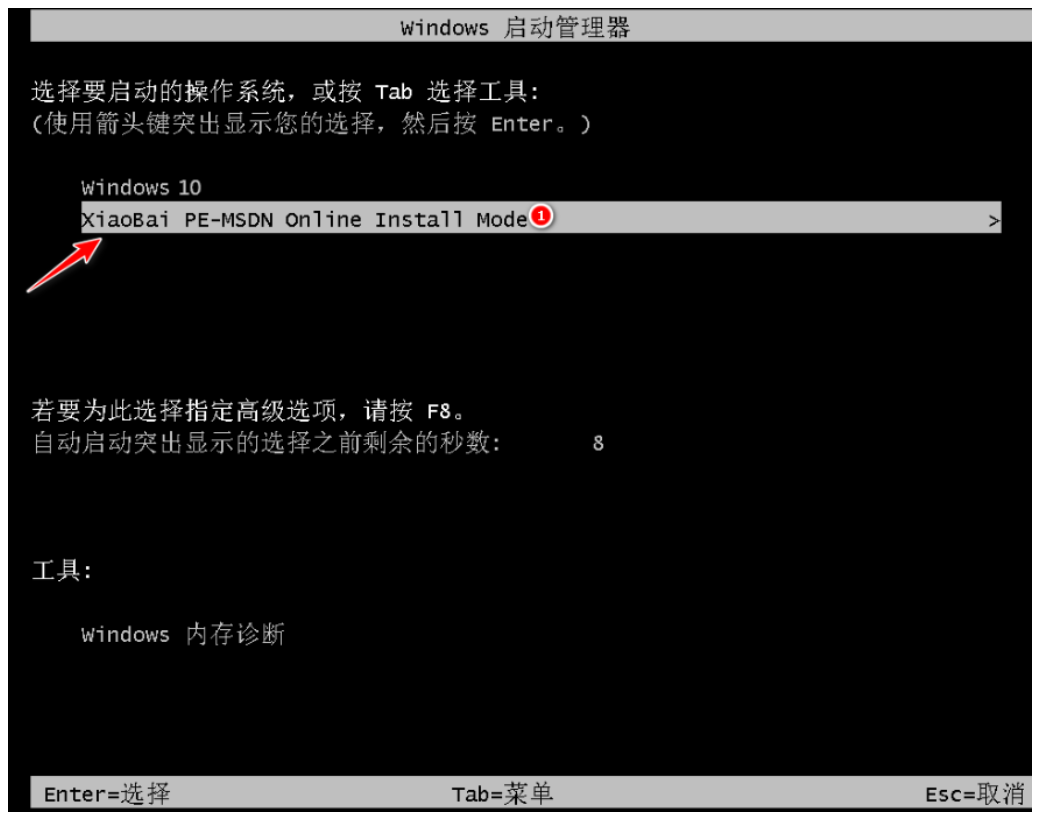 4、電腦重啟后選擇第二項“XiaoBai PE-MSDNONline Install Mode”。