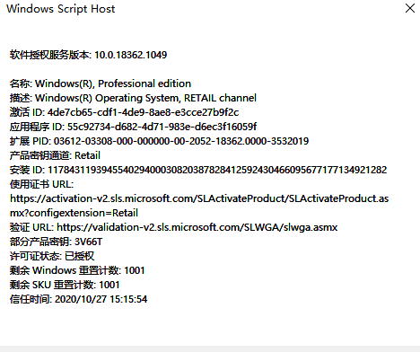 可以查詢到Win10的激活信息,包括:激活ID、安裝ID、激活截止日期等信息。
