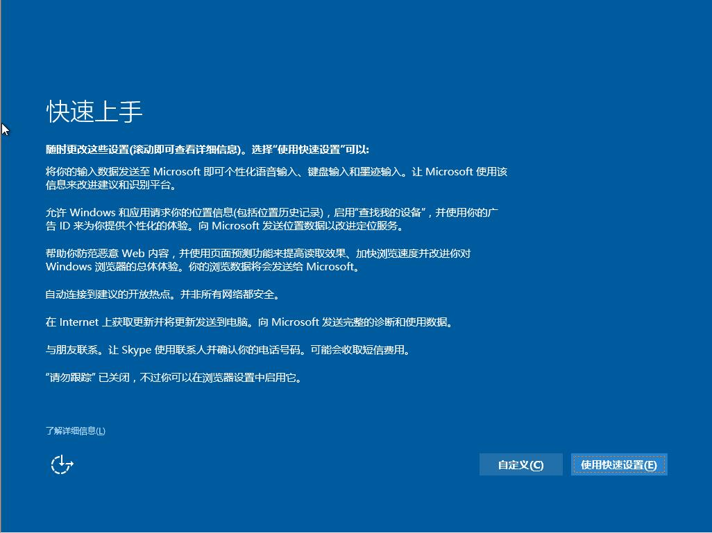 更新過程完成后進入系統設置界面,對升級好的win10系統進行簡單的設置。這里點擊自定義設置或使用快速設置,小編喜歡簡單選擇了快速設置。