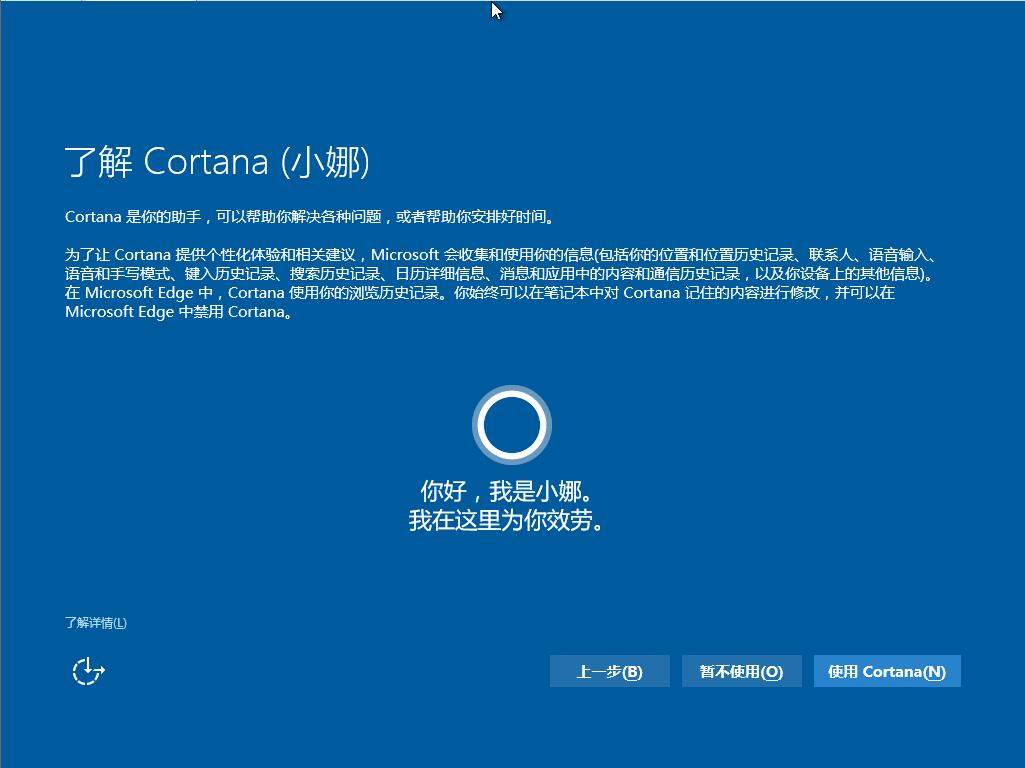 win10的一大特色:Cortana(小娜)語音助手。這里直接下一步就好了。