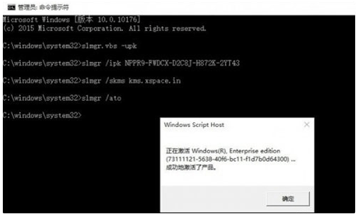 5、輸入以下命令:slmgr /ato,按回車鍵后將彈出窗口提示:“成功的激活了產品”。至此,Win10正式企業版系統激活成功。