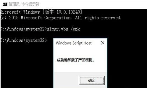 2、依次輸入以下命令:slmgr.vbs /upk,此時彈出窗口顯未“已成功卸載了產品密鑰”。