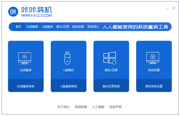 1、首先打開下載安裝好的咔咔裝機工具,選擇“在線重裝”。