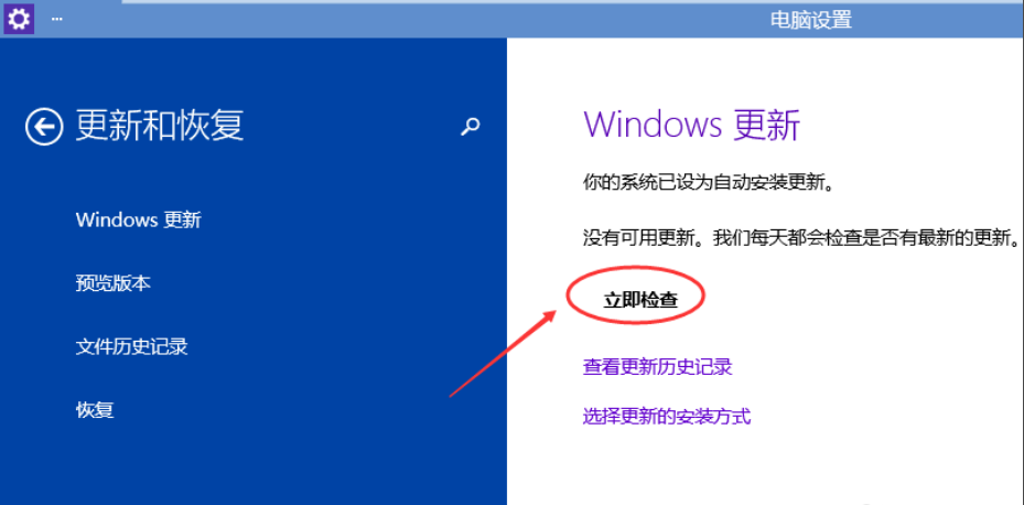2,進入頁面之后,點擊windows更新下的“立即檢查”按鈕。點擊之后即可檢查到有沒有Win10系統的更新升級包,選擇win10系統更新即可。