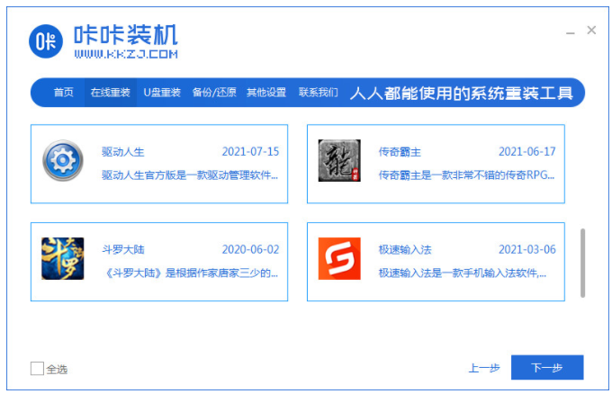 1、打開咔咔裝機工具,選擇在線重裝;