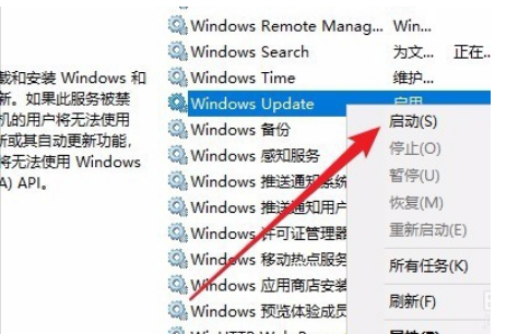 6.接著,在再次打開 Windows服務窗口,右鍵點擊Windows Update服務項,在彈出菜單中選擇“啟動”菜單項。