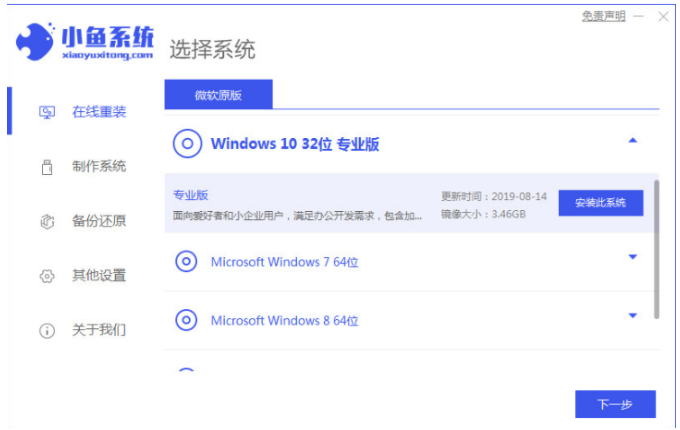2、關閉殺毒以及殺毒軟件,點擊打開小魚軟件,選擇本次需要安裝的win10系統,點擊下一步。