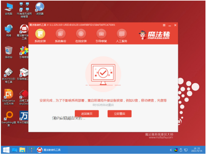 3、在pe系統內軟件自動安裝成功后選擇重啟電腦;