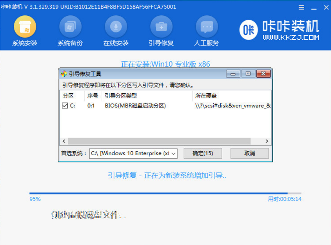 4、系統自動安裝,引導修復工具頁面在C盤前打勾再點擊確定。