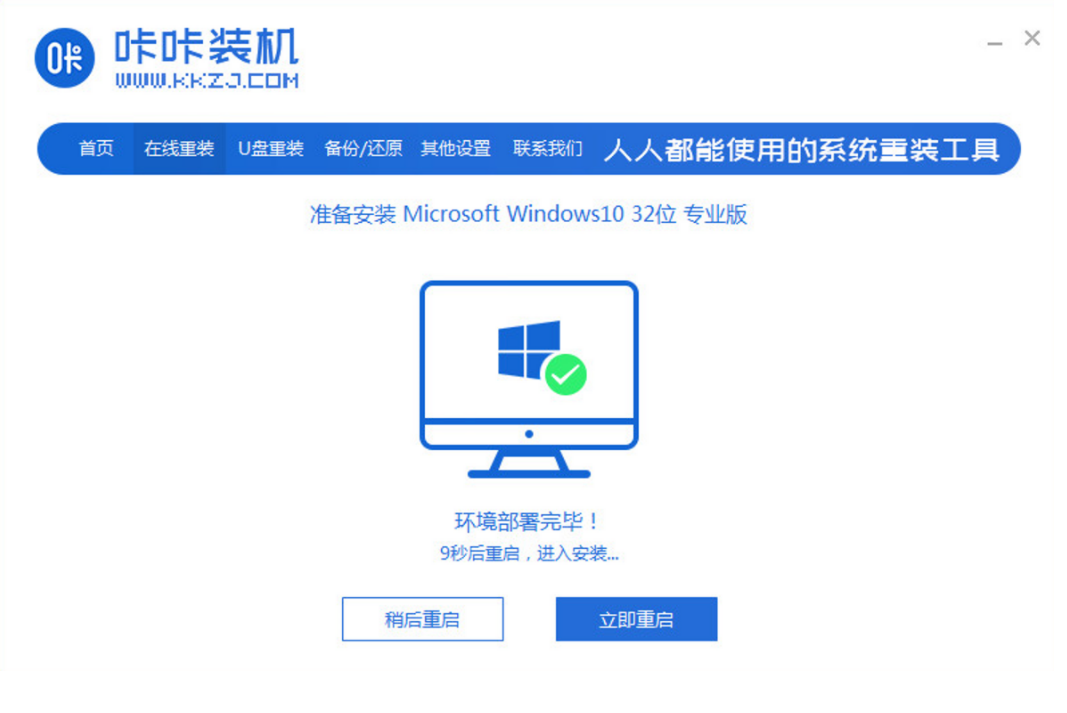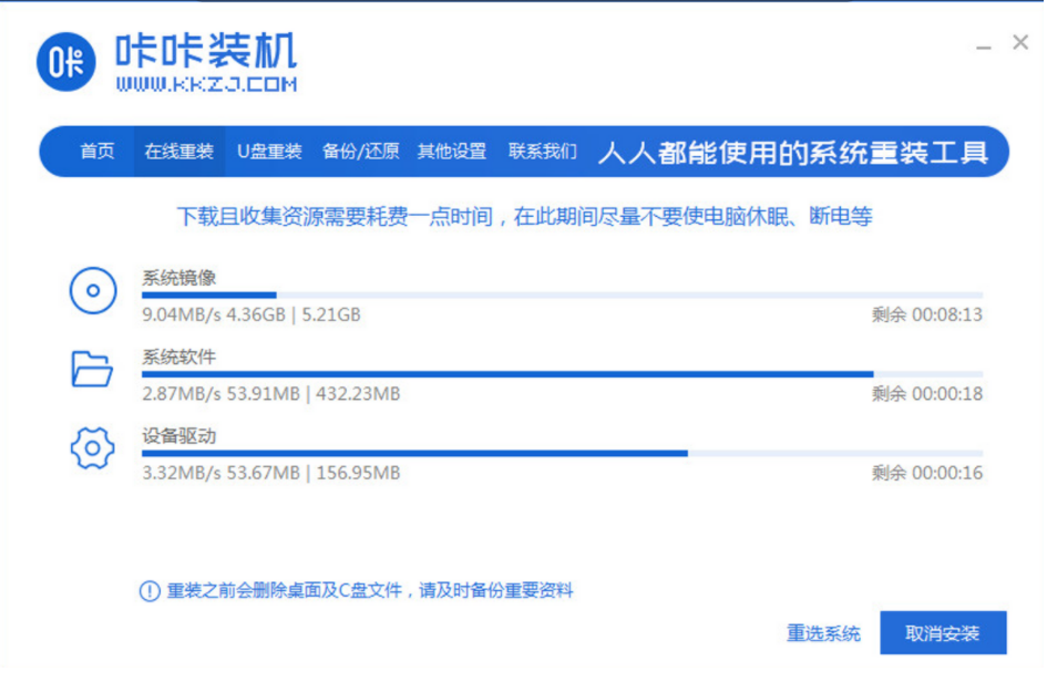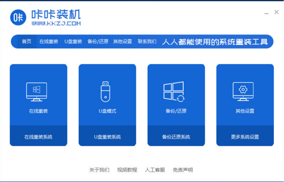 1、下載安裝咔咔裝機工具,點擊在線重裝系統。