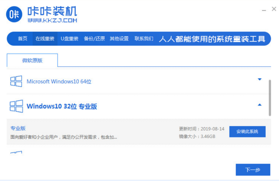1、下載咔咔裝機工具,點擊在線重裝系統。選擇需要安裝的系統版本,點下一步。