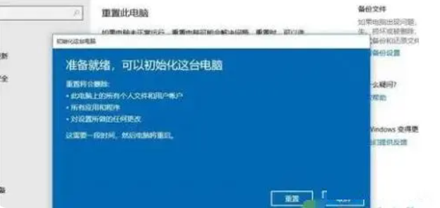 4.當我們選擇完成后在彈出的頁面中會提示重裝時會進行移除的內容,確認無誤之后,點擊【重置】,系統就會開始重裝win10系統。
