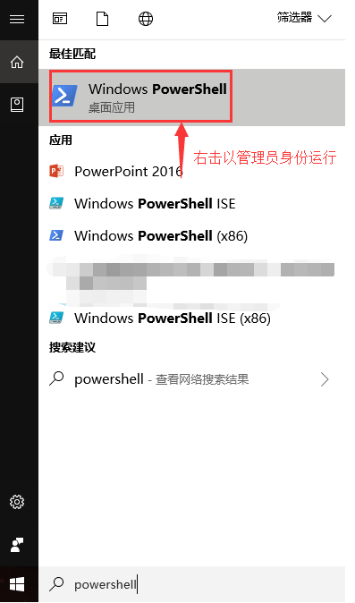 2、首先打開Win10桌面左下角搜索框,輸入powershell,然后鼠標右鍵選擇以管理員身份運行。