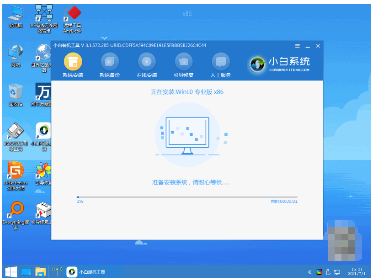 5、進入pe系統桌面后,小白裝機工具開始自行安裝win10系統。