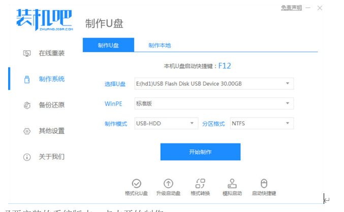 1、下載安裝裝機吧一鍵重裝系統到電腦上,插入U盤到電腦,點擊開始制作。