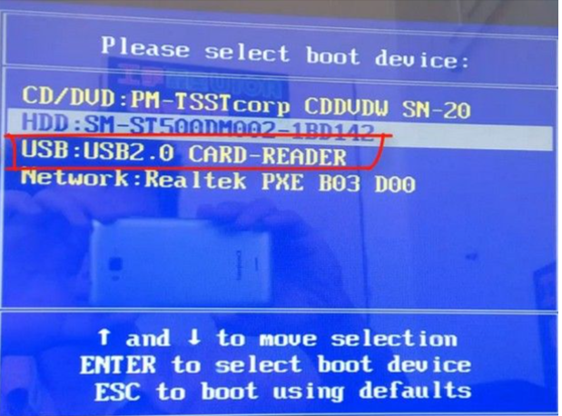 6、把u盤插入我們需要裝系統電腦接口,開機按熱鍵進入啟動項的界面,選擇USB項,按回車鍵進入。
