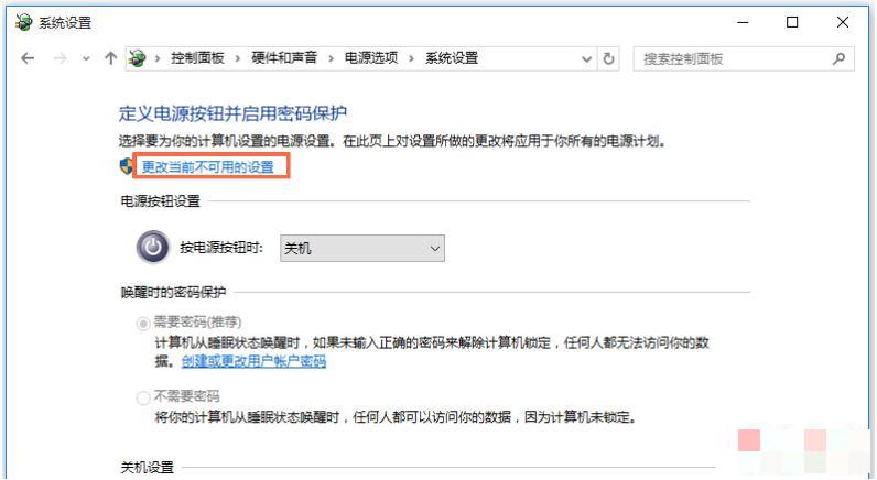 4、然后進入系統設置界面,先點擊【更改當前不可用的設置】,然后勾選【啟用快速啟動】,點擊保存修改即可。