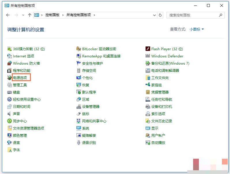 2、打開控制面板,選擇查看方式為小圖標,點擊【電源選項】,