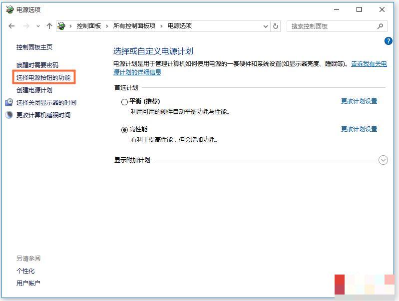 3.打開“電源選項”并找到“更改電源按鈕的功能”以打開,進入下一步。