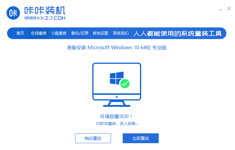 最后咔咔裝機系統部署完成后,10秒自動重啟電腦開始安裝win10系統。