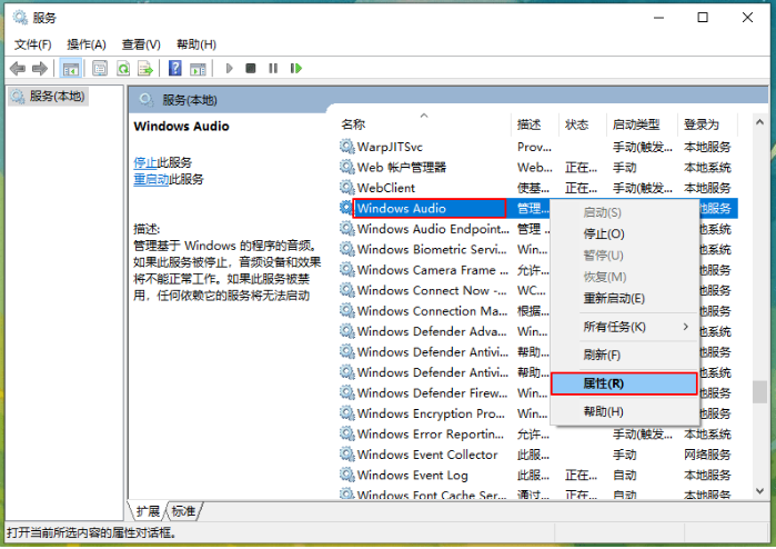 2、在服務界面的右側找到“Windows audio”選項,選中后鼠標右鍵選擇“屬性”打開。