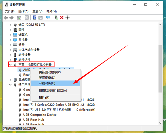 2、鼠標右鍵選中“聲音、視頻和游戲控制器”選項,將其下面的驅動卸載掉。