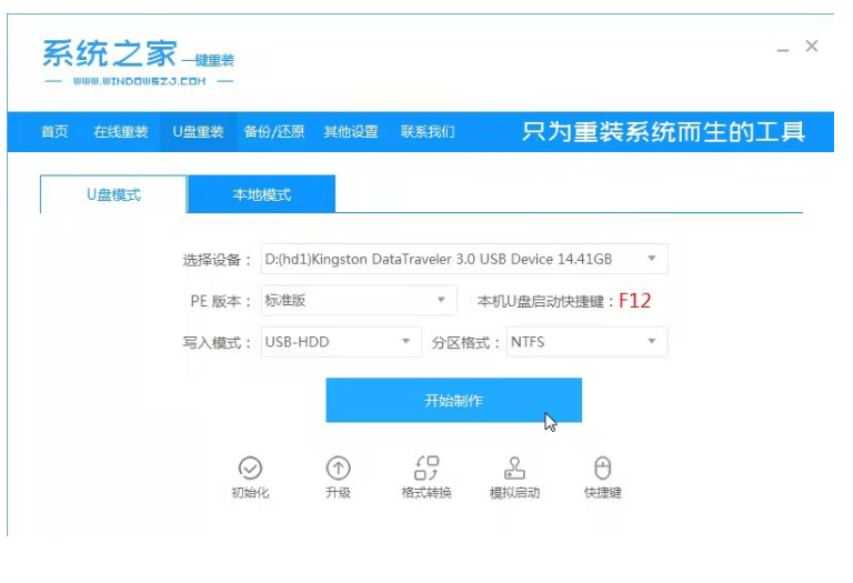 1、可在一臺可用的電腦上下載安裝系統之家一鍵重裝系統工具,可以插入一個8g以上的空u盤,選擇u盤模式方可開始制作。