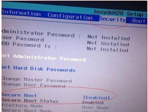 2、然后找到Secure Boot安全啟動選項并關閉。按鍵盤方向鍵選擇各個導航夾,一般在“Security”導航夾內可以找到SecureBoot選項。