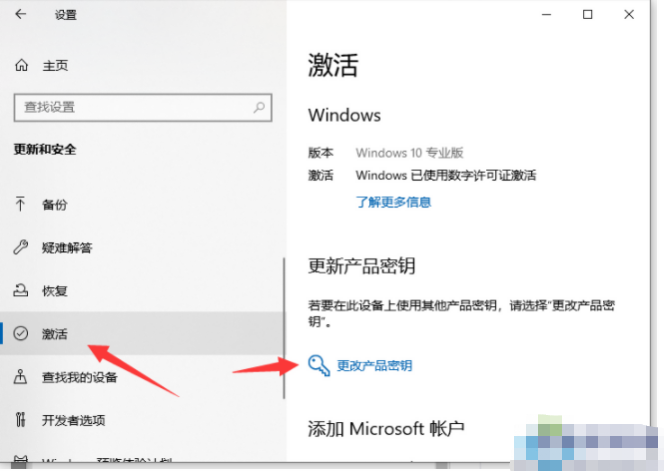 6、在左側找到激活選項,點擊一下后在右側找到更改產品密鑰,系統會彈窗密鑰輸入框,把剛剛復制好的密鑰復制進去點擊確定即可;
