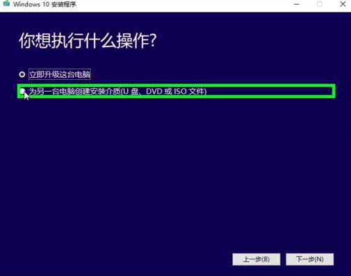 7、有兩個選項,小編這里選擇"為另一臺電腦創建安裝介質(U 盤、DVD 或 ISO 文件) ",之后點擊下一步。