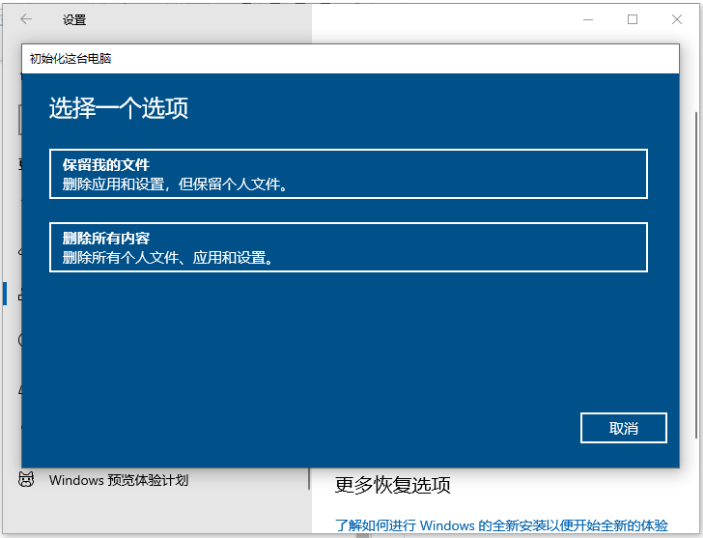 4、在初始化這臺電腦界面,選擇想要的重置方式,可以選擇保留以前的文件與否,建議大家最好保存好個人文件。