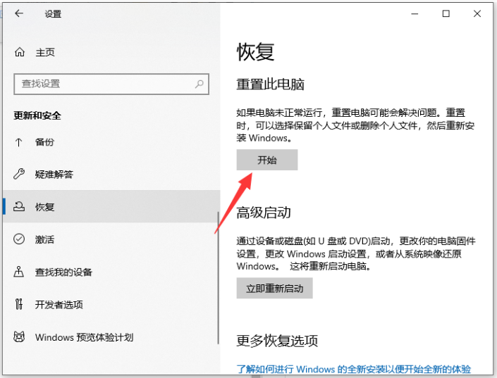3、接著鼠標點擊左側的恢復選項,在右側點擊重置此電腦下面的“開始”選項。