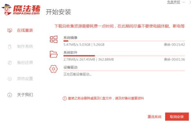 6.進入后魔法豬一鍵重裝系統會開始自動安裝系統,我們等待魔法豬系統完成工作就可以了。