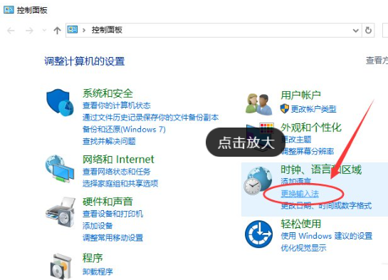 3、在打開的“控制面板”對話窗口中,找到“時鐘、語言和區域”下的“更換輸入法”選項并點擊它。如圖所示: