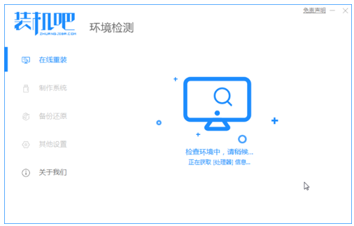 1、下載安裝“裝機吧一鍵重裝系統”工具,打開工具后選擇“系統重裝”,軟件自動檢測本地環境后進入下一步。