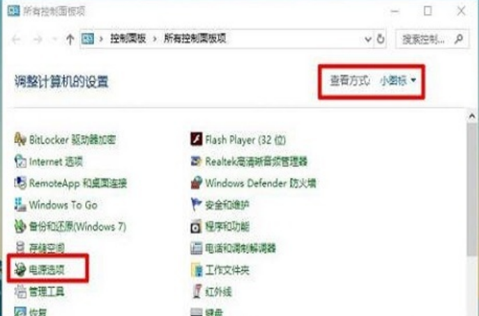 4.隨后,進入“控制面板”后,先將查看方式修改為“小圖標”,在選擇“電源選項”;